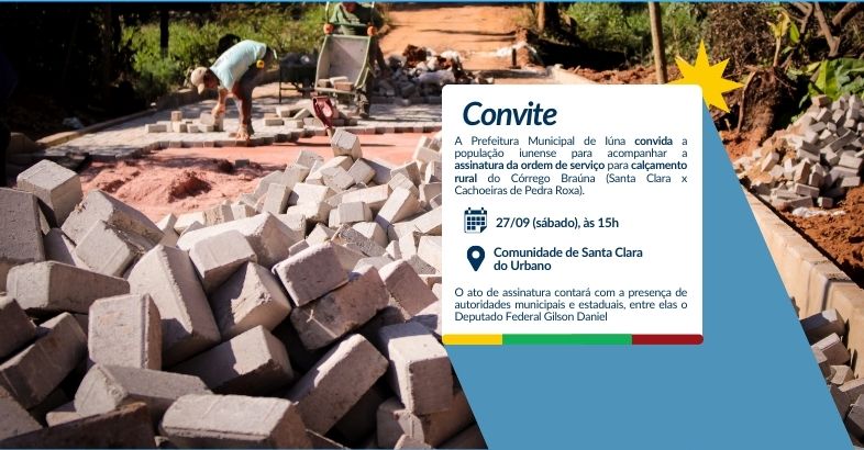 A Prefeitura de Iúna tem a alegria de convidar toda a população para participar da assinatura da ordem de serviço para o calçamento rural do Córrego Braúna (Santa Clara x Cachoeiras de Pedra Roxa).