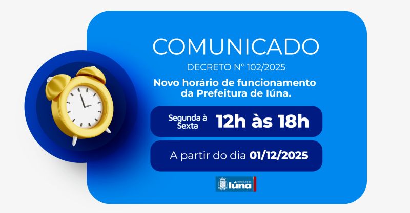 A Prefeitura de Iúna publicou o Decreto nº 102/2025 que diz respeito a redução do horário de expediente nas repartições públicas do município, na qual o atendimento ao público na Prefeitura e demais órgão públicos, passa a ser das 12h às 18h, de segunda a sexta-feira, a partir de 01 de dezembro de 2025.