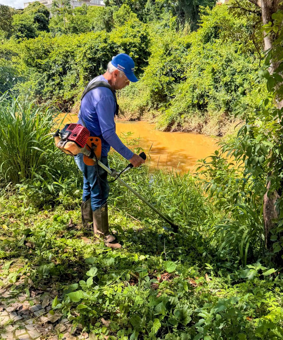 O crescimento excessivo da vegetação nativa e do mato alto pode obstruir a visibilidade e facilitar o descarte irregular de resíduos. A limpeza na margem do rio facilita o escoamento das águas pluviais, elimina pontos de descarte de lixo e melhora a visibilidade para quem circula na região e monitora a presença de resíduos sólidos que poderiam poluir o leito do rio.