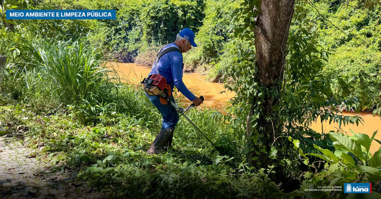 Equipes da Secretaria de Meio Ambiente e Limpeza Pública estão realizando o trabalho de revitalização urbana do município, através da limpeza de praças, canteiros centrais e roçagem na margem do rio.