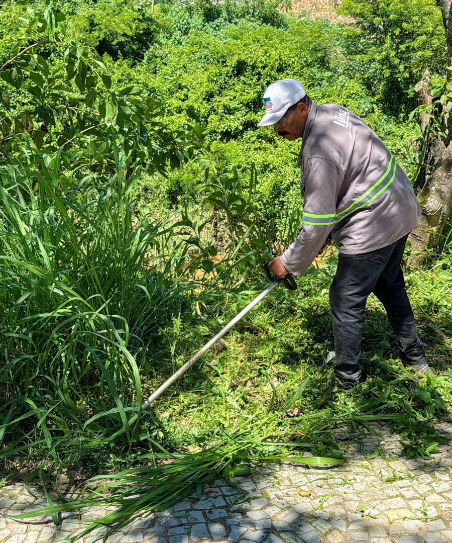 Nas praças e canteiros centrais, o trabalho envolve a retirada de entulhos e a poda ornamental de galhos e grama, para garantir que as áreas de lazer sejam ocupadas com segurança pelas famílias.
