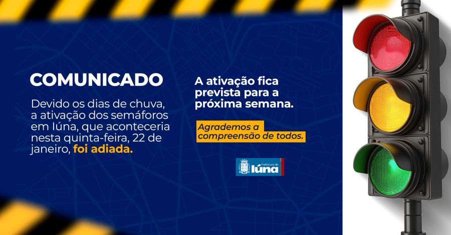 A Prefeitura de Iúna informa que, devido os dias de chuva, a ativação dos semáforos que aconteceria nesta quinta-feira, 22 de janeiro, foi adiada para a próxima semana.