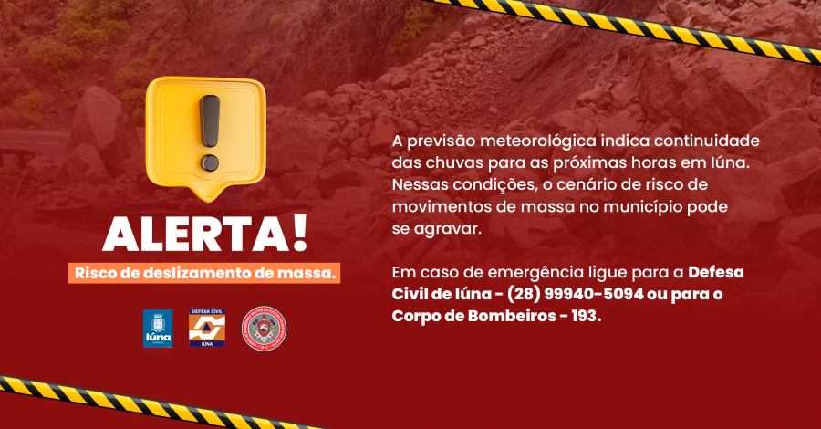 Em caso de emergência ligue para a Defesa Civil de Iúna - (28) 99940-5094 ou para o Corpo de Bombeiros - 193.