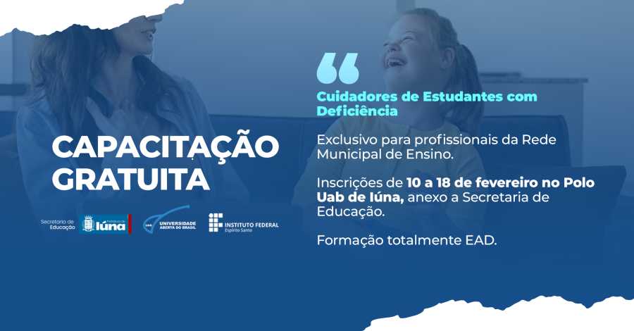 A Secretaria de Educação, através do Polo Uab Iúna, no intuito de melhor propor oportunidades de formação aos nossos munícipes e mantendo o regime de colaboração, vem propor, por meio da parceria com o IFES Campus Ibatiba, a formação continuada aos profissionais da Rede Municipal de Ensino com o curso Cuidadores de Estudantes com Deficiência.