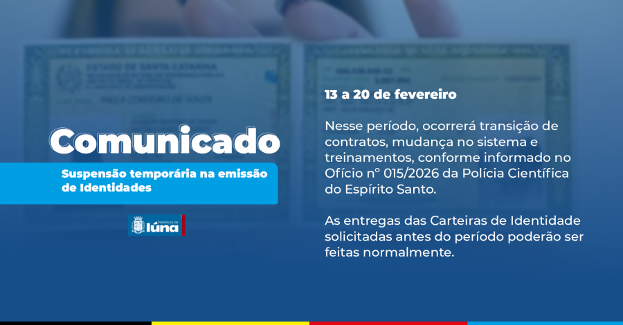 O setor de cadastro de Carteira de Identidade de Iúna informa que de 13 a 20 de fevereiro não serão realizadas as emissões das carteiras, devido o período de transição de contratos, mudança no sistema e treinamentos, conforme informado no Ofício nº 015/2026 da Polícia Científica do Espírito Santo.