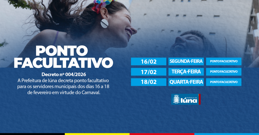 Em virtude do Carnaval na próxima terça-feira, 17 de fevereiro, a Prefeitura de Iúna decreta ponto facultativo (Decreto nº 004/2026) para os servidores municipais dos dias 16 a 18.