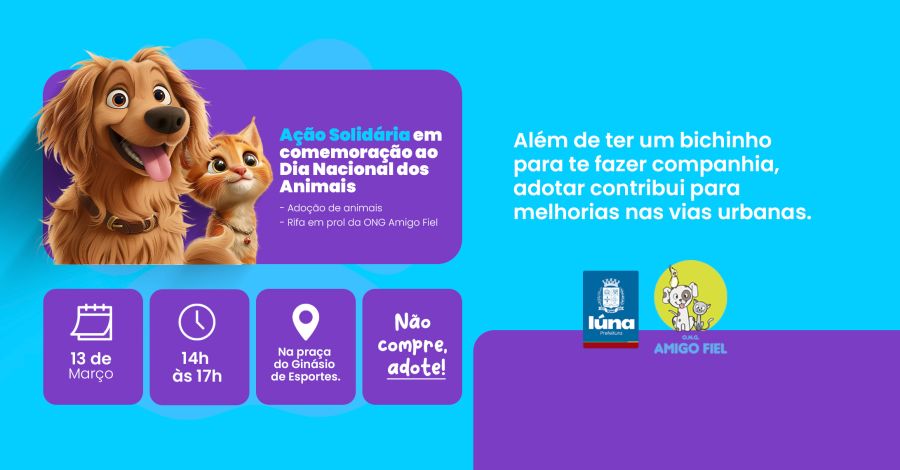 Em comemoração ao Dia Nacional dos Animais (14/03), a ONG Amigo Fiel fará uma ação solidária no dia 13 de março, das 14h às 17h, na praça do Ginásio de Esporte de Iúna.