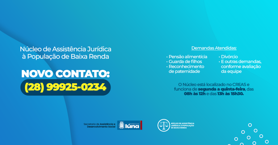 A Secretaria informa que o serviço está com novo número para contato para esclarecer dúvidas e informações: (28)99925-0234. O Núcleo está localizado no CREAS e funciona de segunda a quinta-feira, das 08h às 12h e das 13h às 15h30.