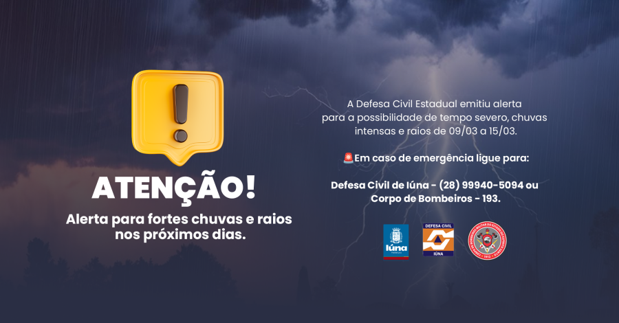 Em caso de emergência ligue para a Defesa Civil de Iúna - (28) 99940-5094 ou para o Corpo de Bombeiros - 193.