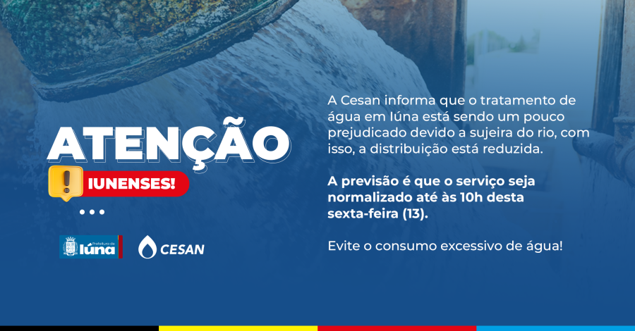 A Cesan informa que o tratamento de água em Iúna está sendo um pouco prejudicado devido a sujeira do rio, com isso, a distribuição está reduzida e pode causar falta de água em alguns bairros nas próximas horas.