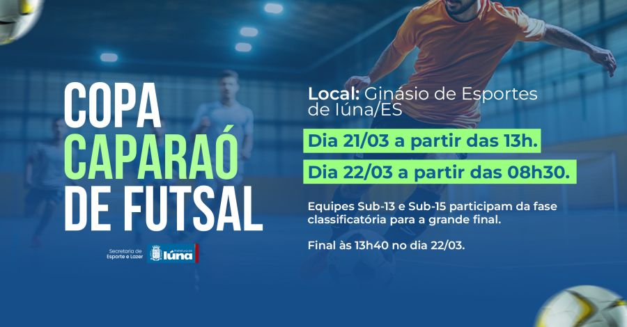 Nos dias 21 e 22 de março acontece a Copa Caparaó de Futsal no Ginásio de Esportes de Iúna. Equipes Sub-13 e Sub-15 entram em quadra para disputar a melhor colocação e chegar a grande final.