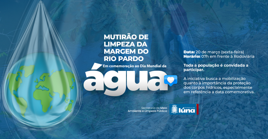 A Prefeitura de Iúna, através da Secretaria de Meio Ambiente e Limpeza Pública, convida todos para participarem do mutirão de limpeza de resíduos da margem do Rio Pardo, que acontecerá nesta sexta-feira, 20 de março, a partir das 07h nas proximidades da Rodoviária.