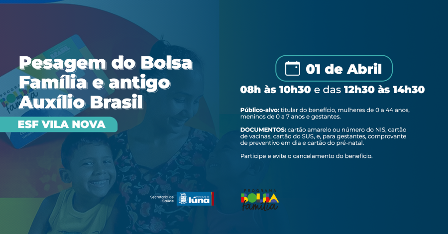 A Secretaria de Saúde informa que a pesagem obrigatória para todos os beneficiários do Bolsa Família e do antigo Auxílio Brasil que utilizam a ESF Vila Nova será no dia 1º de abril, das 08h às 10h30 e das 12h30 às 14h30.