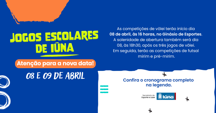 A Prefeitura de Iúna informa que a abertura dos Jogos Escolares que estava prevista para esta terça-feira (07), no Ginásio de Esportes, foi adiada para amanhã (08), às 18h30, pois o Ginásio está sendo usado hoje em um velório. A administração municipal expressa as mais sinceras condolências aos familiares e amigos.