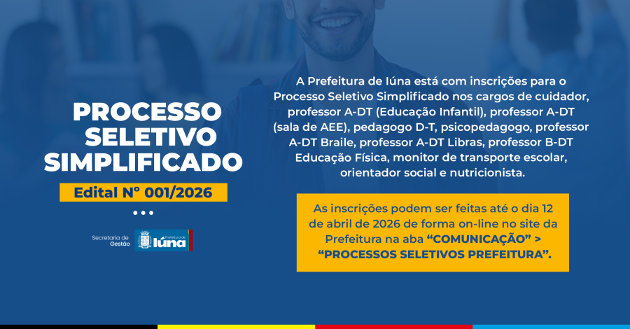 A Prefeitura de Iúna está com inscrições para o Processo Seletivo Simplificado nº 001/2026, de provas objetivas e de títulos, para contratação de profissionais em regime de designação temporária na área da Educação.